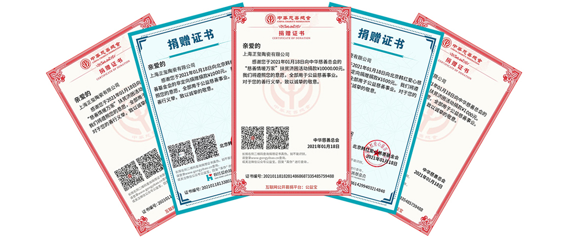 Since June 8, 2013, Zhengxi Ceramics extracted one-thousandth of each order as a charity fund to donate to people in need around the world. Through the China Charity Foundation, the HAN HONG Foundation, and the World Food Organization, The World Health Organization has donated more than 10,000 U.S. dollars to poverty-stricken areas in China and more than 10,000 U.S. dollars to the African Children’s Fund. So far, Zhengxi has donated more than 30,000 U.S. dollars.