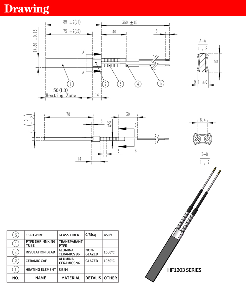 | Model Number | Voltage(V) | Rating power(W) | Width(MM) | Total length Width(MM) | Length under flange(MM) | Length of Hot Zone(MM) | Max.OD.flange(MM) |