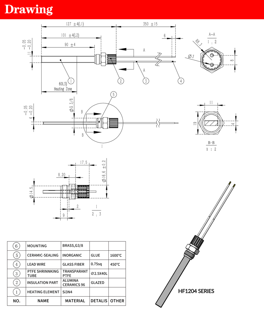 | Model Number | Voltage(V) | Rating power(W) | Width(MM) | Total length Width(MM) | Length under flange(MM) | Length of Hot Zone(MM) | Max.OD.flange(MM) |