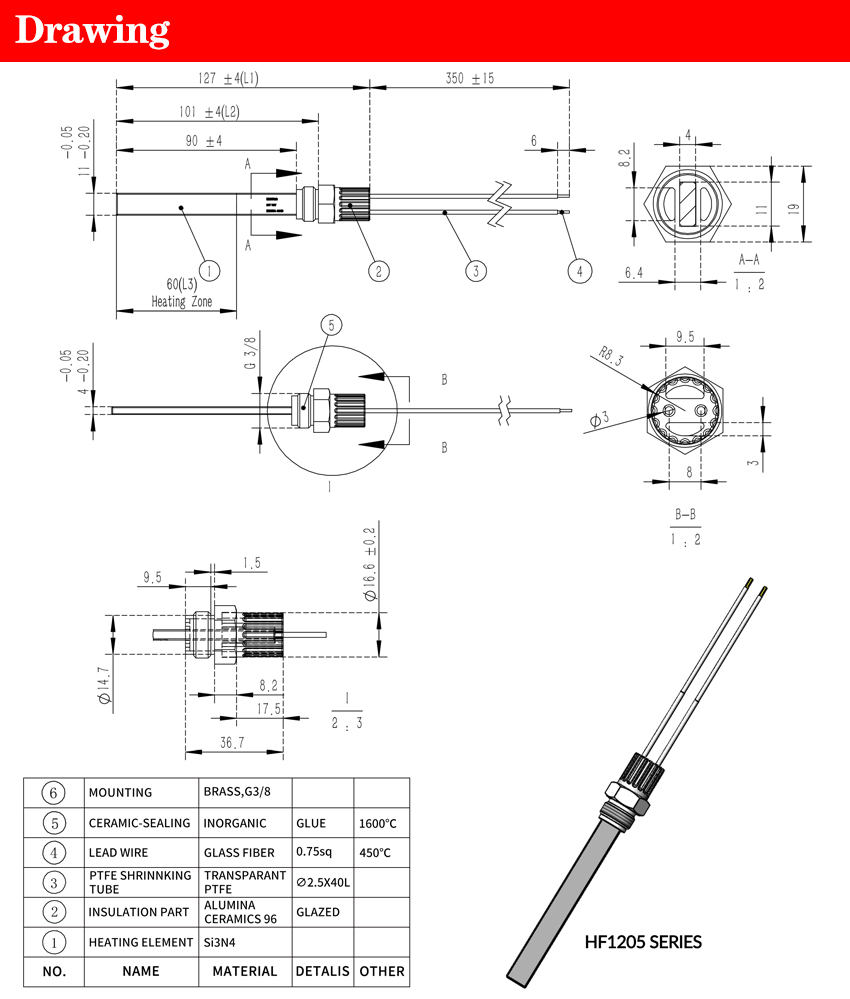 | Model Number | Voltage(V) | Rating power(W) | Width(MM) | Total length Width(MM) | Length under flange(MM) | Length of Hot Zone(MM) | Max.OD.flange(MM) |