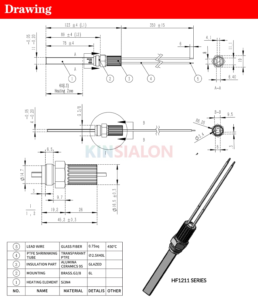 | Model Number | Voltage(V) | Rating power(W) | Width(MM) | Total length Width(MM) | Length under flange(MM) | Length of Hot Zone(MM) | Max.OD.flange(MM) |